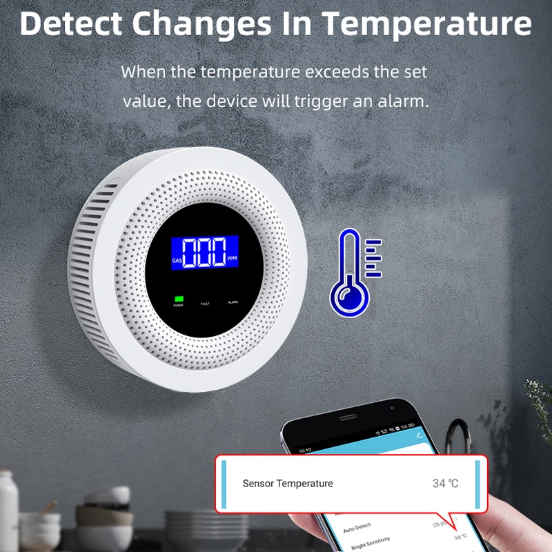 It supports temperature detection. Note: It will only display the temperature value on the APP. Temperature values will not be displayed on the detector screen.
